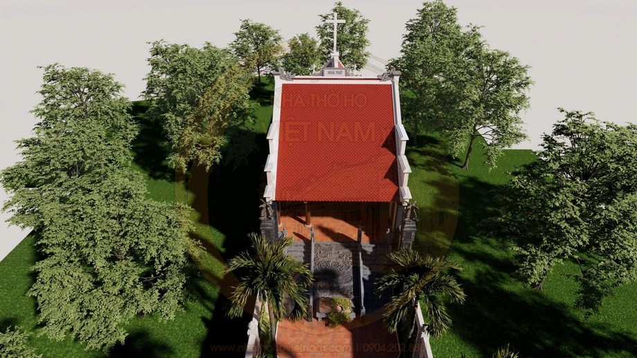 Về bố cục tổng thể, công trình được tổ chức theo trục dọc rất rõ ràng: từ cổng → sân → bậc tam cấp → hiên → không gian thờ chính. Trục này mang tính nghi lễ cao, dẫn dắt người đi từ không gian đời thường vào không gian linh thiêng. Biểu tượng thập giá được đặt ở vị trí cao nhất – chính giữa nóc nhà. Đây là cách xử lý rất “chuẩn tôn giáo”: