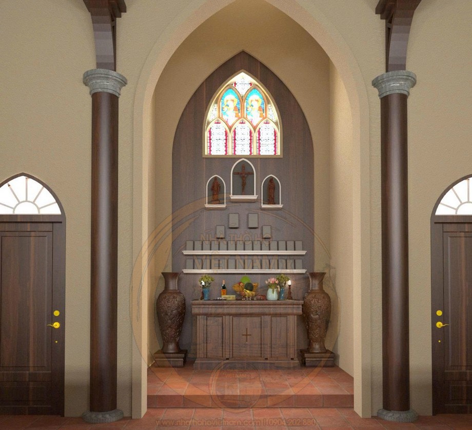Phía trên là khung cửa kính màu nghệ thuật, cho ánh sáng tự nhiên chiếu vào tạo nên không gian linh thiêng. Các tượng thánh và vật phẩm phụng vụ được bố trí cân đối, đảm bảo tính trang trọng cho khu vực thánh lễ.