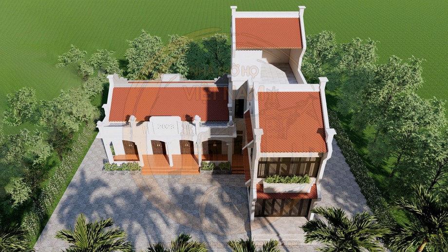 Trong dự án này, không sử dụng hệ cổng tam quan lớn như một số công trình truyền thống, thay vào đó là không gian sân vườn mở, tạo cảm giác gần gũi và thoáng đãng hơn. Khu sân phía trước được lát gạch màu xám kết hợp bậc thềm gạch đỏ, tạo sự tương phản màu sắc hài hòa và sạch sẽ. Hai bên hiên nhà bố trí bồn cây xanh nhỏ, góp phần làm mềm không gian kiến trúc và tạo điểm nhấn tự nhiên. Xung quanh công trình là hệ thống cây xanh bao phủ, giúp điều hòa không khí và tăng tính phong thủy, rất phù hợp với điều kiện tự nhiên của vùng miền núi như Bình Gia.