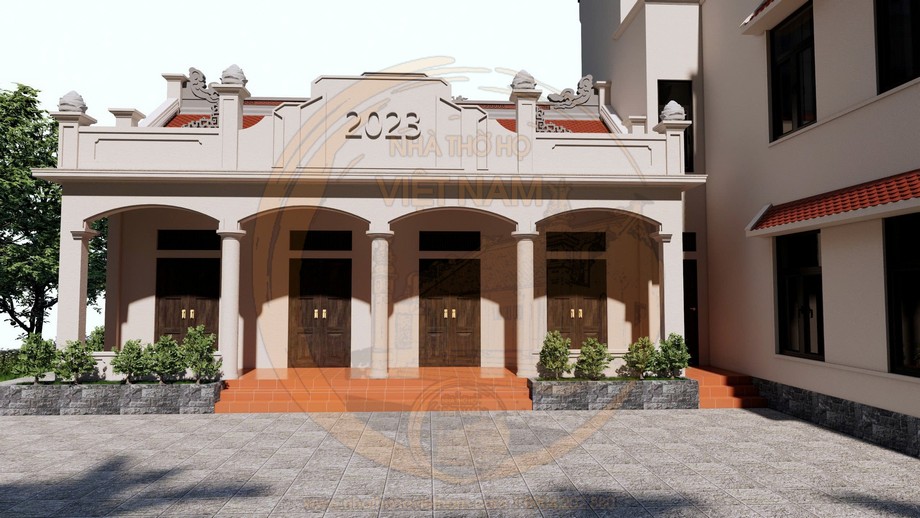 Cửa chính của nhà thờ họ là dạng cửa bức bàn bằng gỗ, chia thành nhiều cánh tương ứng với từng gian, giúp không gian linh hoạt khi sử dụng và tạo cảm giác rộng mở khi cần thiết. Hệ cột hiên phía trước được thiết kế tròn, thanh thoát, nâng đỡ mái hiên và tạo chiều sâu cho mặt đứng công trình. Các chi tiết hoa văn trên phần mái, đầu hồi và lan can được thiết kế đơn giản, không quá cầu kỳ nhưng vẫn giữ được nét tinh tế, phù hợp với xu hướng kiến trúc hiện đại hóa nhà thờ họ. Trên phần chính diện có đắp nổi năm xây dựng “2023”, vừa mang ý nghĩa lưu dấu thời gian, vừa tạo điểm nhấn cho mặt tiền.