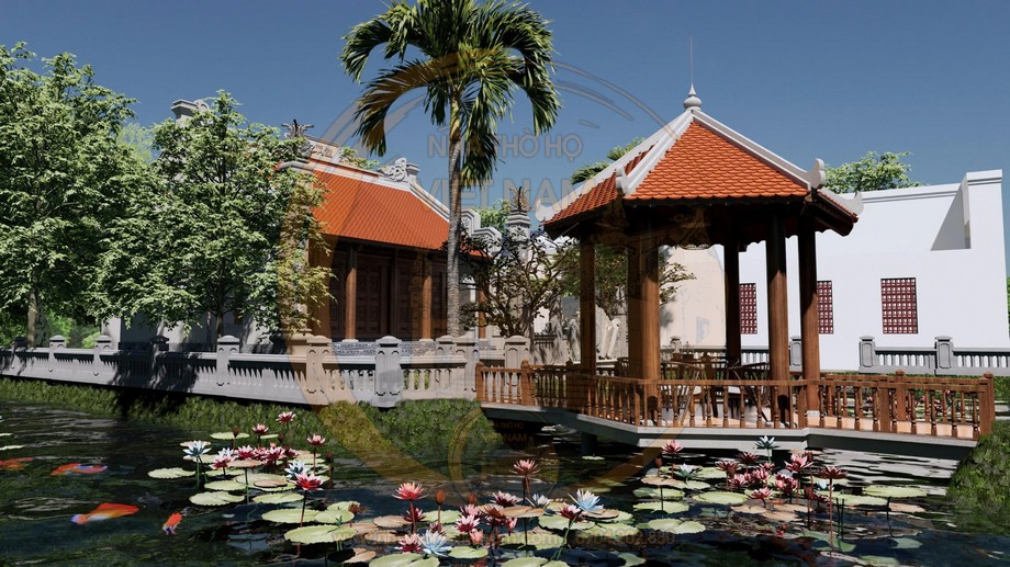 Cùng tham khảo mẫu nhà thờ họ 3 gian kết hợp ao sen tại Thái Thụy Thái Bình và chòi nghỉ với thiết kế trang nghiêm, hài hòa cảnh quan thiên nhiên.
