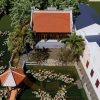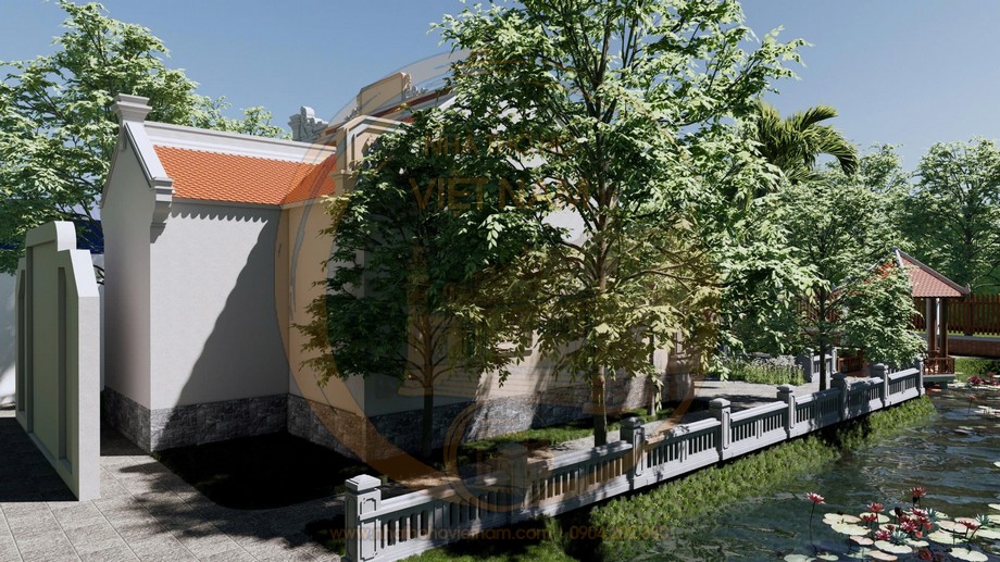 Mẫu nhà thờ họ 3 gian tại Thái Thụy Thái Bình được thiết kế theo phong cách truyền thống với bố cục cân đối, mái ngói đỏ nổi bật cùng các chi tiết trang trí cổ điển. Công trình được đặt ở vị trí trung tâm khu đất, phía trước là sân rộng và ao sen tạo cảnh quan đẹp mắt.